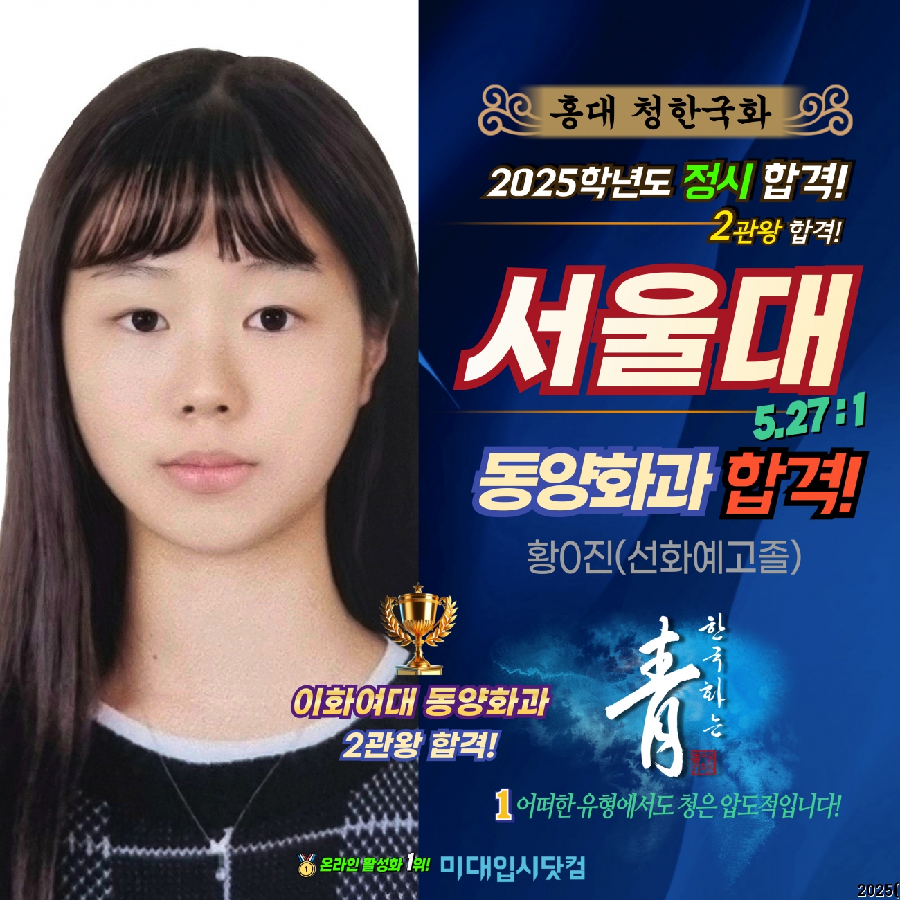 ¹Ì´ëÀԽôåÄÄ Çհݼö±â - 2025Çг⵵(Á¤½Ã) ¼­¿ï´ëÇб³ µ¿¾çÈ­°ú ÇÕ°Ý! Ȳ0Áø(¼±È­¿¹°íÁ¹) - È«´ë û ¹Ì¼úÇпø