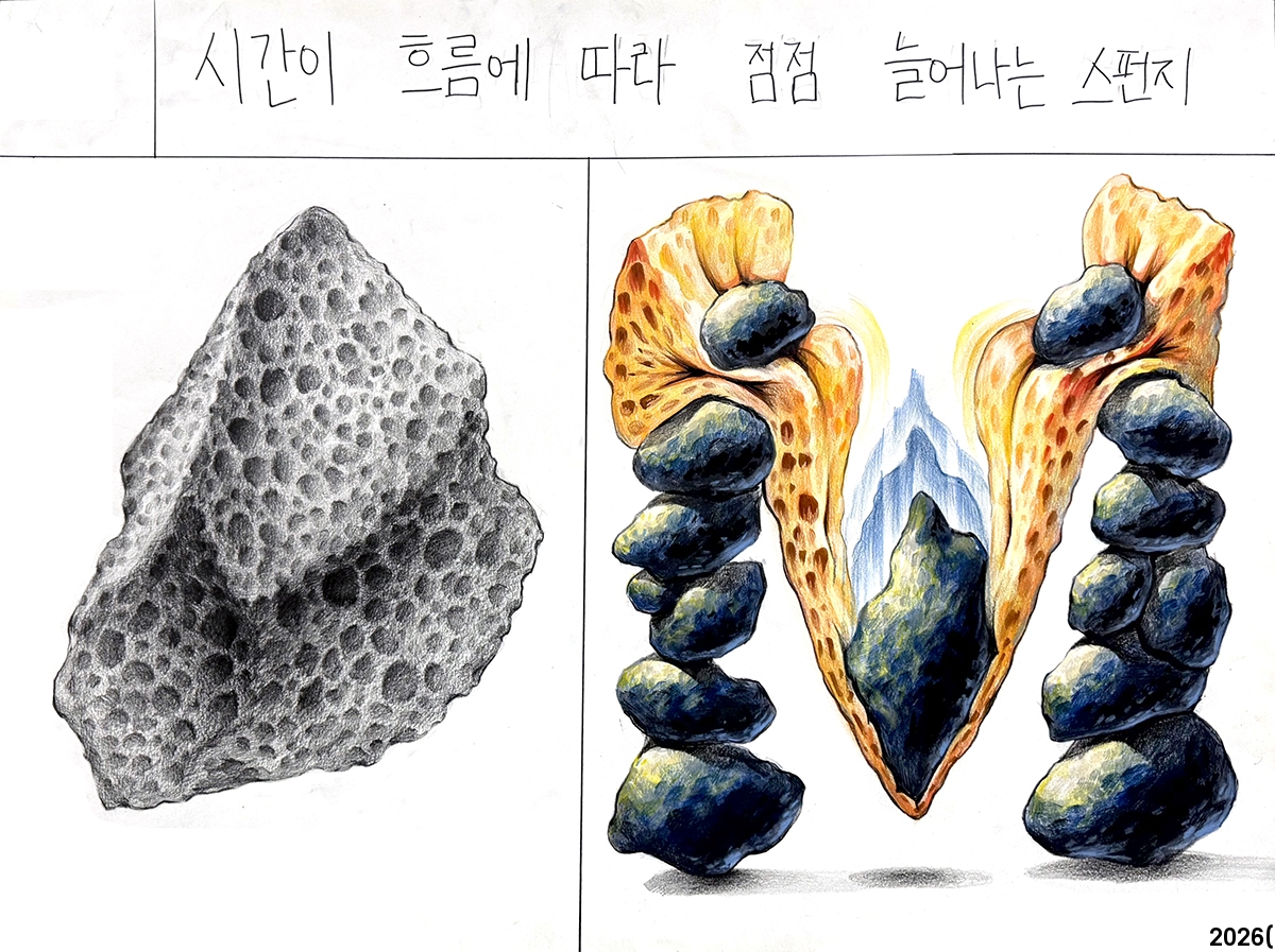 µ¹°ú ½ºÆÝÁöÀÇ ÇüÅÂ¿Í Æ¯¼ºÀ» ÀÌ¿ëÇ϶ó´Â Á¶°ÇÀ» ¸ÂÃß´Â °ÍÀ» °¡Àå Áß¿äÇÏ°Ô »ý°¢Çß°í, ½ºÆÝÁöÀÇ À¯¿¬ÇÔ°ú µ¹ÀÇ ¹«°Ô°¨À̶ó´Â Ư¼ºÀ» ÃÖ´ëÇÑ È°¿ëÇÏ¿© ¹®Á¦¸¦ Ç®ÀÌÇØ¾ß°Ú´Ù°í »ý°¢Çß½À´Ï´Ù. ½Ã°£ÀÇ È帧À» ´õ Àß Ç¥ÇöÇÒ ¼ö ÀÖµµ·Ï µ¹ÀÇ ÀÜ»óÀ» ±×·Á³Ö¾ú½À´Ï´Ù.